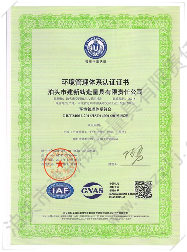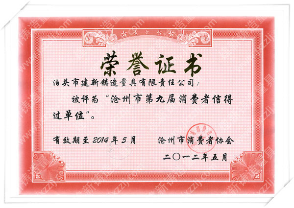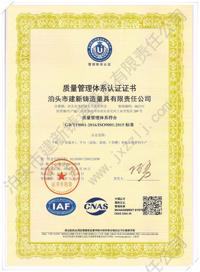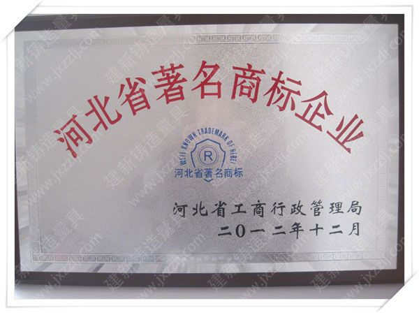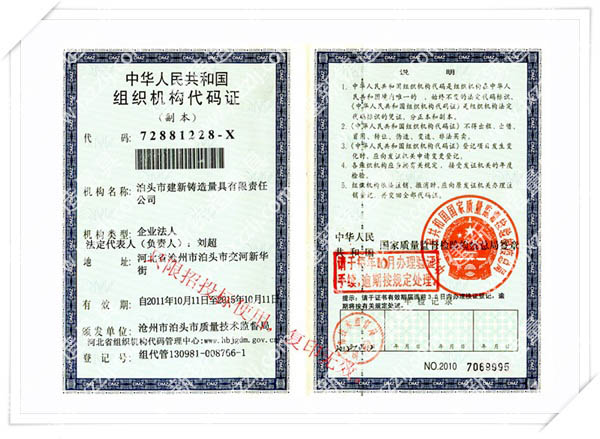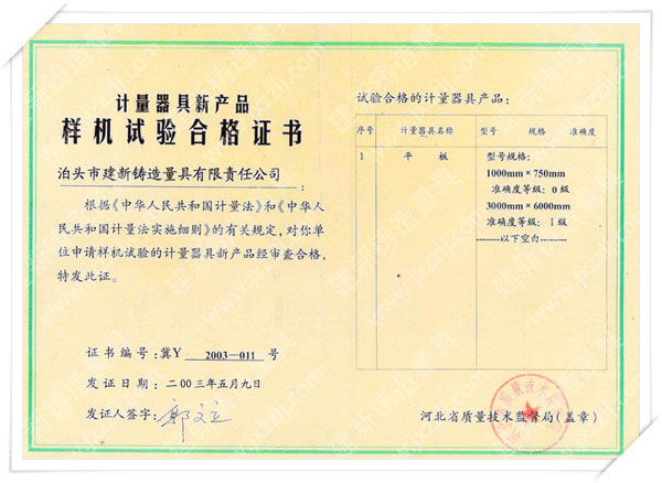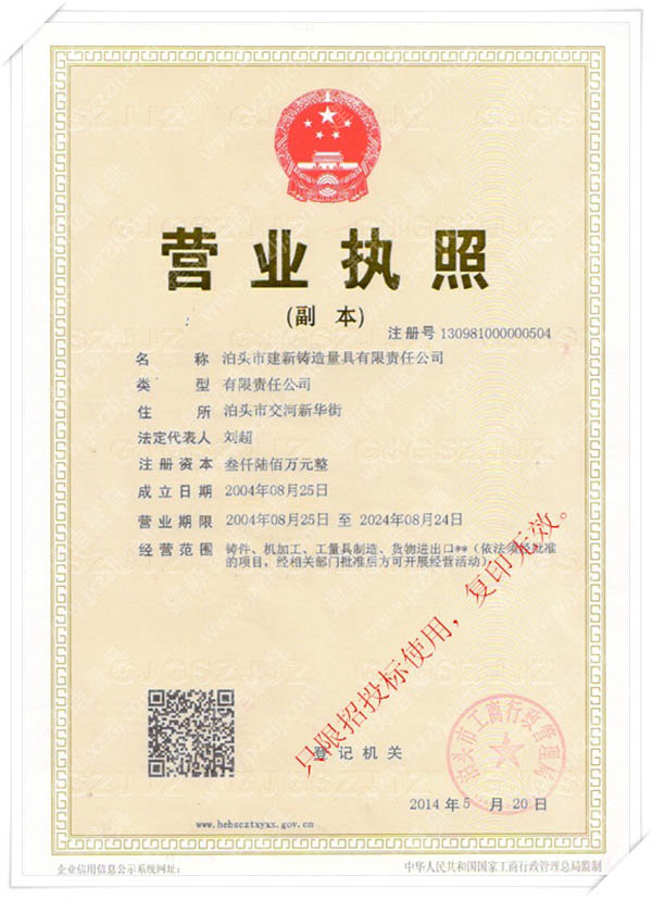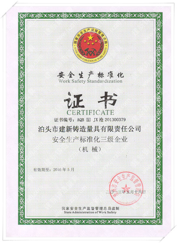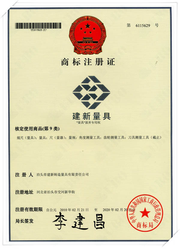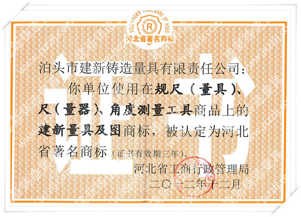 泊頭市建新鑄造量具有限責(zé)任公司是河北省固定資產(chǎn)重點(diǎn)投資項(xiàng)目技術(shù)企業(yè)。取得“建新量具-商標(biāo)注冊(cè)證”“河北省名牌產(chǎn)品”、“河北省著名商標(biāo)”、中國(guó)鑄造協(xié)會(huì)常任理事單位“機(jī)械工業(yè)質(zhì)量管理獎(jiǎng)”、“滄州市第九屆消費(fèi)者信得過單位”、“中國(guó)人民銀行機(jī)構(gòu)信用代碼證”“、計(jì)量器具新產(chǎn)品樣機(jī)試驗(yàn)合格證書“全國(guó)安全生產(chǎn)三級(jí)認(rèn)證企業(yè)”等榮譽(yù)稱號(hào)。